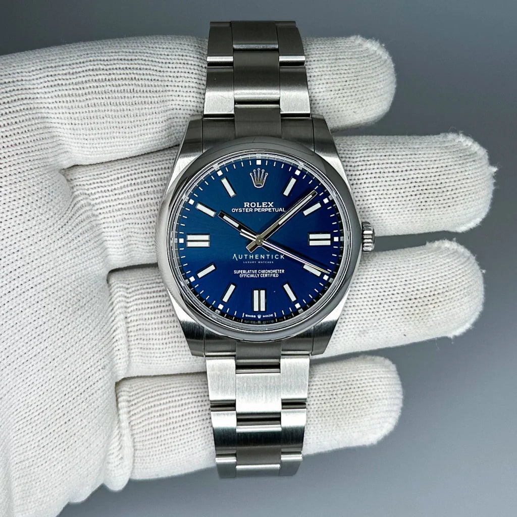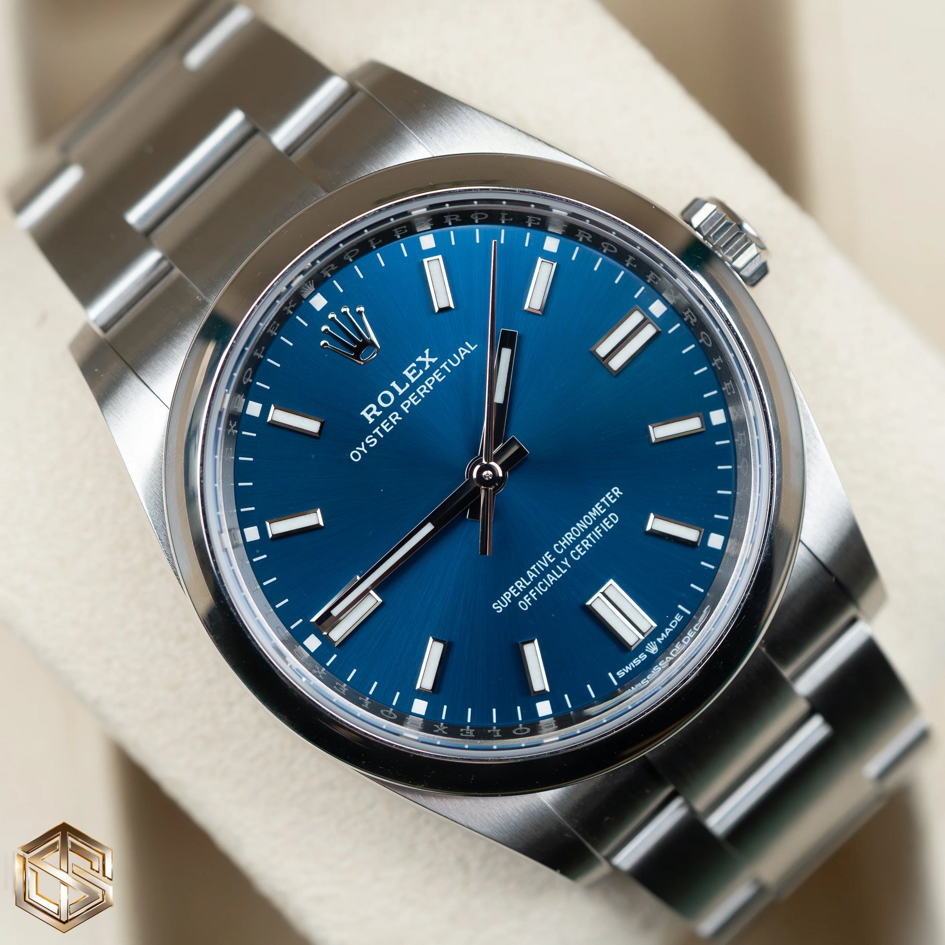 The Rolex Oyster Perpetual with a stunning blue dial and stainless steel bracelet embodies timeless elegance and modern luxury. Crafted with precision and durability, it features an officially certified automatic chronometer movement, offering both reliability and sophistication. A perfect choice for those who appreciate classic style combined with contemporary refinement.